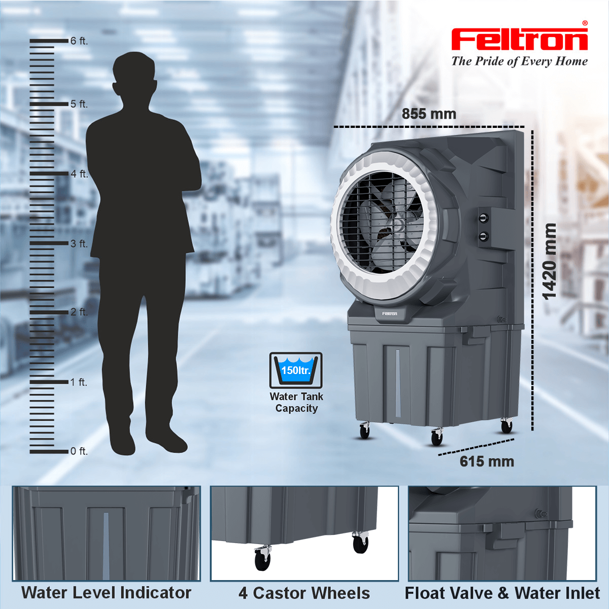 We use the Turbocool Plus in our office hall, and the air throw is very powerful. The large tank capacity is a huge plus for long working hours. It’s built like a tank and looks very professional. Excellent value for money from Feltron.